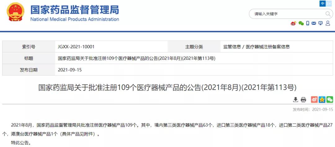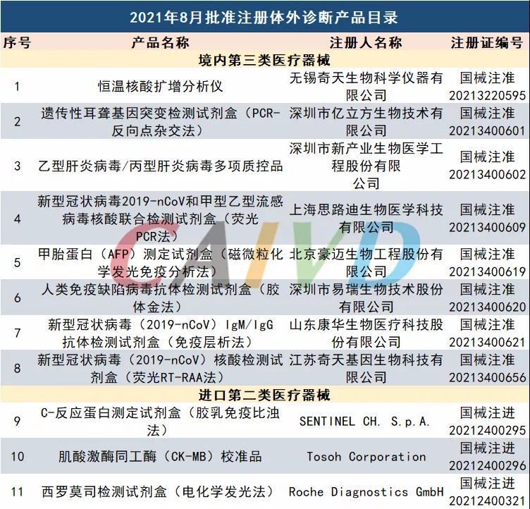 2021年8月,国家药品监督管理局共批准注册医疗器械产品109个。其中,体外诊断产品11个,境内第三类体外诊断产品8个,进口第二类体外诊断产品3个。