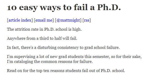 慢性完美主义者往往也是拖延症患者。那些“志向远大”的热爱学习、而不是搞研究的学生往往都有拖延症。读博士似乎对所有拖延症患者都有极强地吸引力,不幸的是,它同时也像是一个筛子,淘汰了那些效率低下的研究生。拖延症患者应该看看我写的关于提高效率的建议。